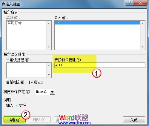 这里我们以“Alt+1”为例。在键盘上按下“Alt+1”后,窗口底部的“指定”按钮会变为可用状态。如下图所示: