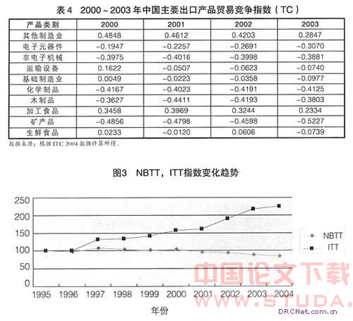 国际竞争力是衡量一国对外贸易发展水平的重要指标。本文选用产业贸易竞争指数来衡量我国出口商品的竞争力状况。如果用X表示某产业的出口总额,M表示该产业的进口总额,则产业贸易竞争指数(TC)为:TC=(X-M)/(X+M),如果TC<0,表明该产业竞争力较弱;TC=0,表明该产业虽有一定的竞争力,但不是太强;TC>0,则表明该产业竞争力较强。从表4数据可知,我国初级产品出口竞争力呈现下降趋势,工业制成品则有所改善,但出现波动。这与我国出口商品结构由初级产品向制成品转变的趋势相符。在工业制成品当中,具备一定竞争力的主要是轻纺等劳动密集型产品,而最能体现一国竞争力水平的机械及运输设备虽然其竞争力有所上升,但仍呈现出较弱的竞争力。这说明改革开放以来,尽管我国对外贸易发展迅猛,但外贸产业竞争力并未得到根本上和实质性的改变。如果从产业竞争力的角度来衡量,则可以认为我国对外贸易的发展基本是属于贫困化增长或者说面临贫困化增长的危险。